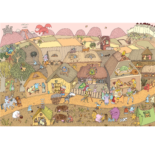你可以信手翻閱,每一頁都是奇幻小鎮的某個場景,場景中無數的鎮民,都在忙著自己的事,你可以說說看,他們分別在做什麼呢?每翻一頁,場景都換到不同地點,這時鎮民們又做了什麼不一樣的事呢?