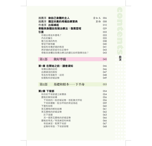 本書中所介紹的「骨骼與身體自我矯治療法」(Ortho-bionomy)也是眾多西方療法之一,都是透過對於身體的認識與了解,配合適度的運動及調整,修正過去不良的習慣,讓肌肉、骨骼和關節處在力學上最有效率的狀態,進而減緩錯誤體態對健康所造成的影響。