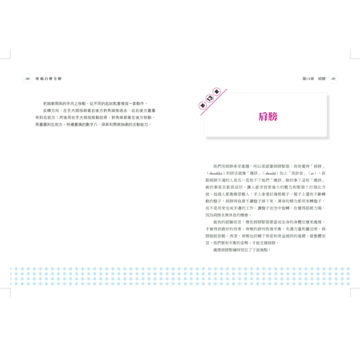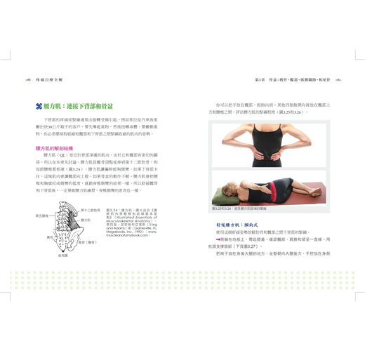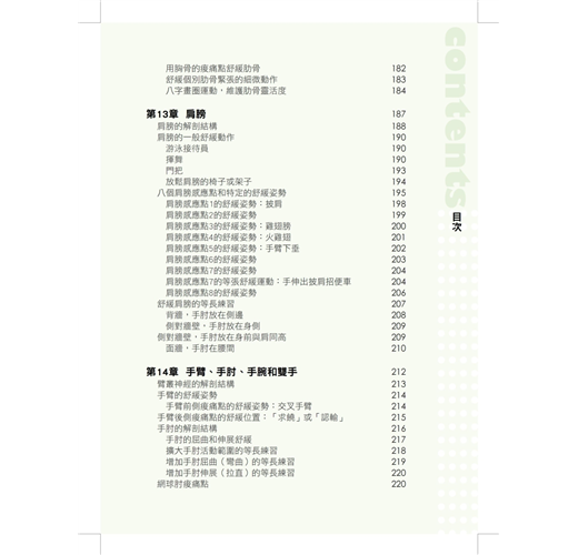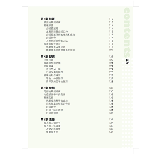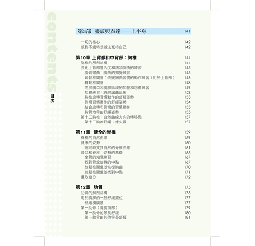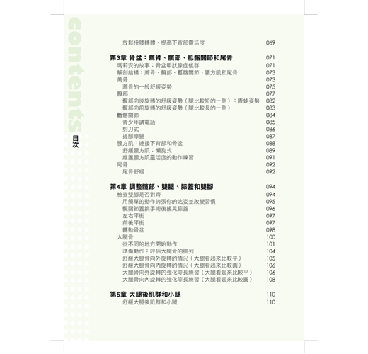在書中的第四部,作者還很貼心的介紹了坐骨神經痛、脊椎側彎、拇趾外翻、失眠、慢性疲勞等,現代人最容易出現的特殊狀況,平常大家最關心的問題,在最後這個章節都能夠找到解決的答案,相信學會之後,無論是對自己或是對家人,都會有很大的幫助。