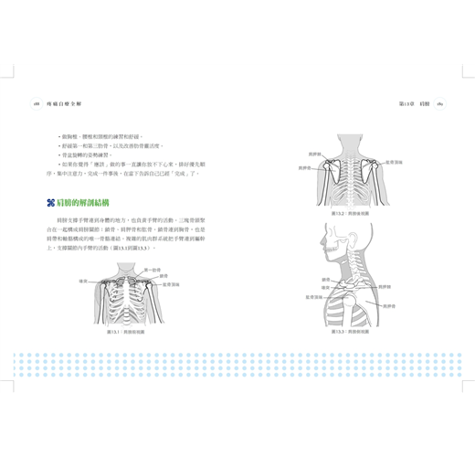 我很喜歡書中詳細的圖解,讓讀者可以很清楚的認識自己的身體,穿插在文中的案例,則讓閱讀變得更有趣生動,而用身體各部位所細分成的療癒法,更是讓我們在家中就可以成為自己的家庭醫師,學會療癒方法善待身體,從頭顱、眼睛、耳朵、脖子、脊椎、臗關節、膝蓋,直到腳底,作者都很詳盡的說明了大家最常見的問題,並且介紹居家就能做的簡易自療法。最重要的是,手法都很簡單喔!無論是運動或是特定的按壓手法,都很具體且完整的呈現,讓人一看就可以馬上學會,不用花大錢、上醫院,就可以快速的舒緩疼痛、增進健康。