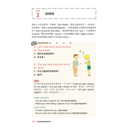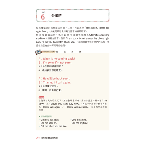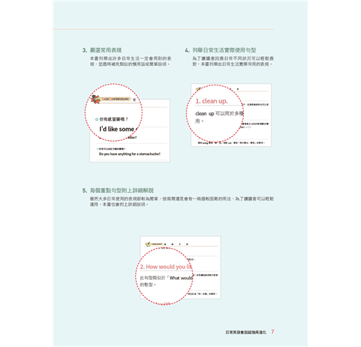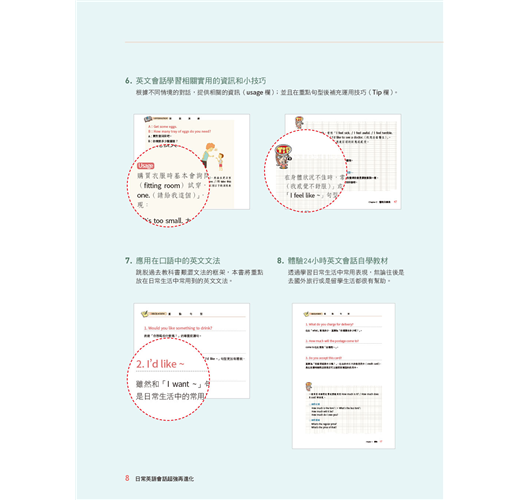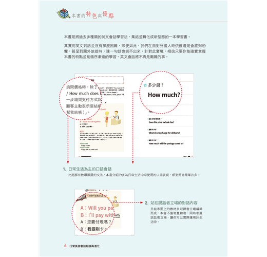 涵蓋「購物、用餐、娛樂、工作、讀書、電話聯絡」…等各種生活場景中常用到的情境會話,