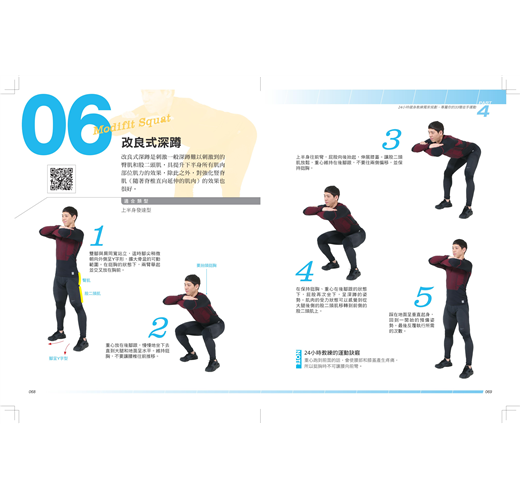PART1:久坐不動會讓身體出代誌,不要再對不起自己的身體了 久坐不動的話,身體健康遲早出代誌 想改善久坐習慣,就要現在馬上動起來 每個人都需要專屬教練,量身打造運動課表 PART2:想要成功瘦下來,不要再拿沒錢沒時間當藉口 運動不該受時間與空間的限制,就算沒錢也能運動瘦身 每個人的運動方式及飲食,都會不一樣 PART3:你專屬的24小時健身教練,量身打造適合的瘦身方式 找出適合自己的運動方式,運動才會有效果 安教練的體質診斷教室 類型1:體質虛弱型 類型2:盲目減肥型 類型3:想擁有美國隊長身材的瘦弱男 類型4:下半身發達型 類型5:上半身發達型 類型6:隱性肌肉型 各體質適合的運動課表 類型1:體質虛弱型 類型2:盲目減肥型 類型3:想擁有美國隊長身材的瘦弱男 類型4:下半身發達型 類型5:上半身發達型 類型6:隱性肌肉型 PART4: 24小時教練獨家規劃,專屬你的33種徒手運動 01 V-Step V字踏步 02 Knee Up 高腳抬膝 03 Lunge 弓步伸展 04 Leg Raise 平躺抬腿 05 Lateral Step&Pull 側步上舉 06 Modifit Squat 改良式深蹲 07 Burpee Test 波比操 08 Bridge 橋式運動 09 Side Punching 側面出拳 10 Shoulders Push-Up 壓肩伏地挺身 11 Superman 超人式 12 Squat-Knee-Up 深蹲高抬膝 13 Squat Burpee Test 深蹲波比操 14 Spiderman Plank 蜘蛛人撐地 15 Jumping Jack 開合跳 16 Knee Wave Push-Up 跪式伏地挺身 17 Dead Lift 徒手硬舉 18 Lying Sit-Up 仰臥捲腹 19 Mountain Climber 登山者 20 Butt Kicker 後腳踢臀 21 Burpee Split 弓步波比操 22 Squat 深蹲 23 Squat Lunge 弓步深蹲 24 Step Burpee Test 踏步波比操 25 Arm Walking 伏地走路 26 Wonder Woman 神力女超人 27 Wave Push-Up 波浪式伏地挺身 28 Power Skip 爆發跳躍 29 Push-Up 伏地挺身 30 Frog 蛙式趴地 31 Plank 手肘撐地 32 Hands Plank 平板撐地 33 Hip Opner臀部外展