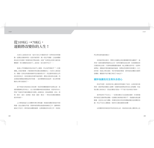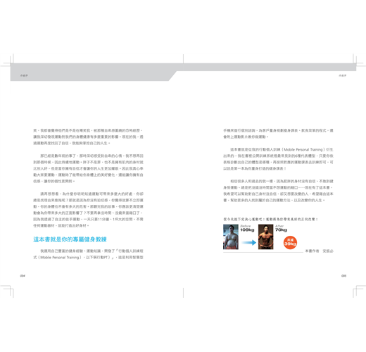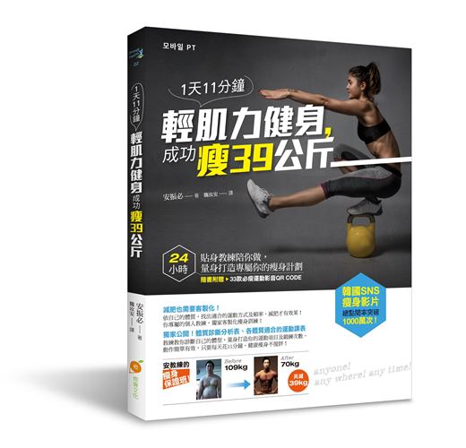 從109KG→70KG,運動改變人生的真實故事! 大部分人總是很忙碌,每天忙碌工作還要利用一些零碎的時間運動,這實在很難辦得到。但是仔細想想,萬一現在不運動,之後身體健康出狀況怎麼辦?那個時候才開始後悔,說著「如果我以前努力維持身體健康、努力運動的話就好了」這些話,就已經來不及了…… 每個人不想運動的理由有成千上萬種,所以我們要賦予「一定要運動」的強烈動機,才會激發你想自動自發運動的心。大部分人總是認為,運動一定得去有健身教練所在的健身房才行,而且還得找鄰近公司或住家的地方,但找到適合的場所後卻發現,價格太貴沒辦法負擔,而且裡面的運動設備看起來好老舊……這些種種原因加起來,就又將想運動的心情打退堂鼓了。 底下來跟大家說我自己的故事。我是有氧體操國家代表隊出身,是個對運動樂在其中的人,從小我的運動神經就相當發達,甚至有許多人問我「到底你不會的運動是什麼啊」這類的話,因為像舉重、游泳、滑雪、潛水、溜冰、跆拳道、柔道、健身、衝浪……等各式各樣的運動我都非常拿手。 上大學後我進入生活體育科學大學就讀,對健身相關的領域非常感興趣,因此成績也不錯,那個時候我開始做健身教練的工作,讓學業和健身工作並行。那時我的身體很健康,從事喜歡的科目和工作,和朋友們之間也都相處很融洽。 但是後來我去當兵,軍隊生活讓我以前的腰傷變得更加嚴重了,後來我一直都受腰椎間盤突出之苦。我常到醫院去做治療,但是腰痛的狀況還是無法改善,只要稍做運動腰就會痛,晚上睡覺也很辛苦,從那時候開始,運動這件事就離我越來越遠,我開始用酒精來消除壓力。大三的時候,我當上學生會長,有許多喝酒的聚會,那時我的身體狀況變得很糟糕,體重竟不知不覺已來到了109公斤。 胖並不是罪,但是有許多人變胖的同時遺失了自信,以前的我性格爽朗,總是帶給周遭的人歡樂。但變胖後我開始害怕與人群接觸,而且我討厭人多的地方,更加討厭我只要走一下下就汗流浹背的汗臭味。 後來我終於下定決心,一定要改變自己並且重拾健康,於是睽違兩年後我又重新開始運動。在腰傷日漸康復的情形下,我緩緩地增加運動量,並且全心投入運動,幸運的是我本來就有運動經驗及這相關的知識,所以下定決心運動後,我終於又重拾健康的身體。 以前變胖的時候是非常沒有自信心的,假如我走在路上聽到有人在笑,我都會覺得他們是不是在嘲笑我,被那種自卑感圍繞的恐怖經歷,讓我深切發現運動對我們的身體健康有多麼重要的影響。現在的我,透過運動再度找回了自信,我能夠掌控自己的人生。 那已經是數年前的事了,那時深切感受到自卑的心情,我不想再回到那個時候,因此持續地運動。胖子不是罪,也不是擁有肌肉的身材就比別人好,但是當你擁有自信才會讓你的人生更加耀眼。因此我真心奉勸大家要運動,運動除了能帶給你身體上的美好變化,還能讓你擁有自信感,讓你的個性更開朗。 請再想想看,為什麼你明明知道運動可帶來多麼大的好處,你卻總是找理由來推拖呢?那就是因為你沒有迫切感,你覺得就算不立即運動,你的身體也不會有多大的危害。那聽完我的故事,你應該更清楚運動會為你帶來多大的正面影響了?不要再拿沒時間、沒錢來當藉口了,因為我透過了自主的徒手運動,一天只要11分鐘、1坪大的空間、不需任何運動器材,就能打造出好身材。 我運用自己豐富的健身經驗、運動知識,開發了「行動個人訓練程式(Mobile Personal Training),以下稱行動PT)」,這是利用智慧型手機來進行個別諮詢,為客戶量身規劃瘦身課表、飲食菜單的程式,還會附上運動影片教你做運動。 這本書就是從我的行動個人訓練(Mobile Personal Training)衍生出來的,我在書裡公開訓練系統裡最常見到的6種代表體型,只要你依表格診斷書自己的體型是哪種,再按照對應的運動課表去訓練即可,可以說是第一本為你量身打造的健身課表! 相信很多人和過去的我一樣,因為肥胖的身材沒有自信、不敢到健身房運動、總是把沒錢沒時間當不想運動的藉口……現在有了這本書,我希望可以幫助對自己身材沒自信,卻又想要改變的人,希望藉由這本書,幫助更多的人找到屬於自己的運動方法,以及改變你的人生。
