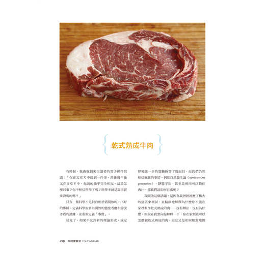 超過10項科學實驗──包括發粉的作用、肉類需要靜置、味道來自於油脂、牛排該用鹽醃多久、如何在家熟成牛排等等。