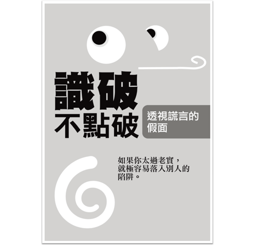 其實謊言也有好壞之分,我們日常生活中那些無關痛癢的謊言在很多時候不過是一種語言遊戲,雖然我們隱瞞了事實的真相,但並沒有人因此而遭受任何損失。與此相反,社會中還有很多人的謊言卻極具殺傷力,有時甚至是帶有毀滅性的。比如某男士對某女士進行感情欺騙,如果在欺騙結果造成之前沒有被識破,那麼很有可能會給那位女士帶來難以癒合的傷口;又如小人造謠生事,無中生有,對別人進行攻擊,如果不能識破他的謊言,肯定有人會被他的流言所傷;再比如,職業騙子打著行善的幌子到處招搖撞騙,如果被他蒙蔽,結果也一定非常慘……諸如此類的謊言數不勝數,但它們有個共同的特點,就是具有欺詐性,以損人利己為目的。這是謊言家族中最惡劣、最讓人憎惡的一種。於是,懂得如何識破謊言,準確地說是洞悉別人的謊言,特別是欺詐性的謊言,而不被別人識破,便成為一種處世的藝術。