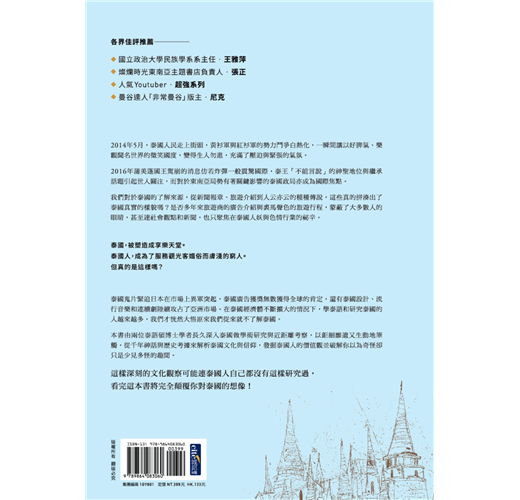 透過這本書,我們能解開對於泰國這個熟悉又陌生的國度,長久增長累積的好奇心與困惑,更加了解泰國人充滿餘裕與微笑的生活及文化,建構出你心中更貼近真實的泰國印象!