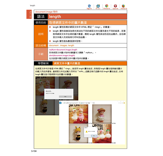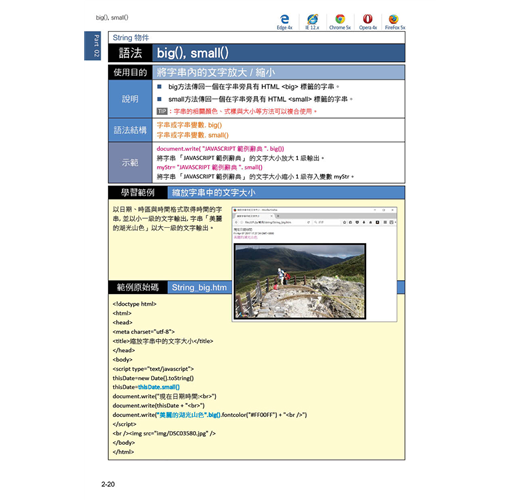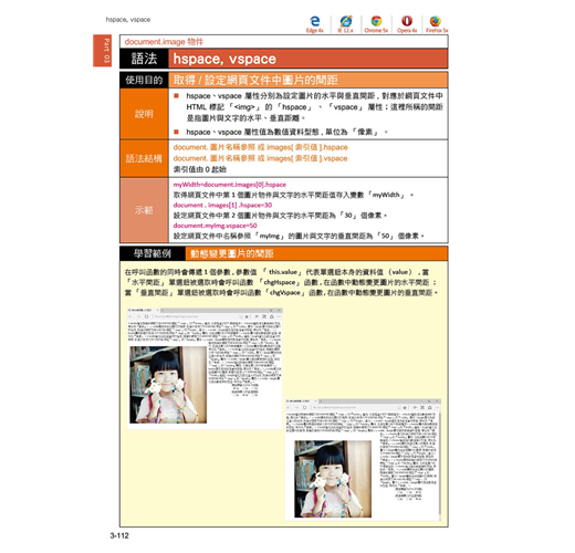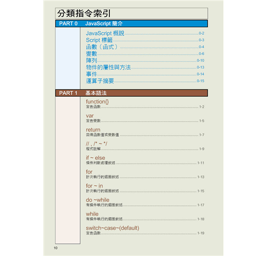 對於 Front-End 網頁前端設計師來說, JavaScript 的重要性十足, 但是就算學過 JavaScript, 也不一定都會記得各式各樣的語法, 有時想要套用某種效果, 卻不知道該用哪個語法。本書精心整理豐富的 JavaScript 語法範例, 配合清楚的範例圖片及瀏覽器對應, 並設計查詢索引, 讓你隨查隨用, 是您在設計網頁時最方便的參考書。