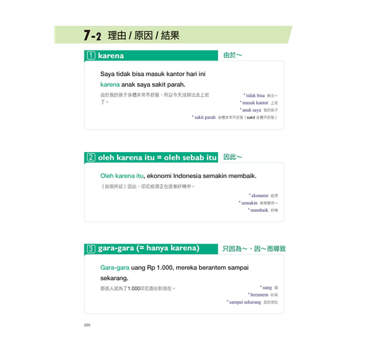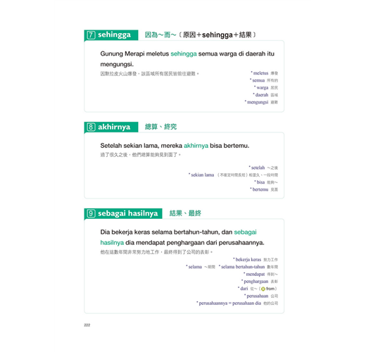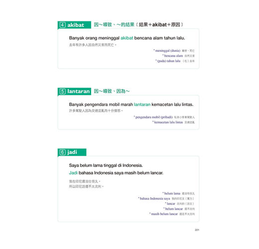 相信你已經發現,只要懂得這些詞綴規則,要倍數增進印尼語實力根本不是難事。而本書中,將會仔細說明這些詞性的應用,同步達到背單字的連鎖效果。除此之外,還有「不過、但是、所以、因此…」等許多交談上必用的各種表達,一次學好印尼語沒問題。