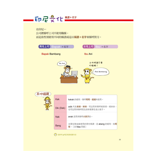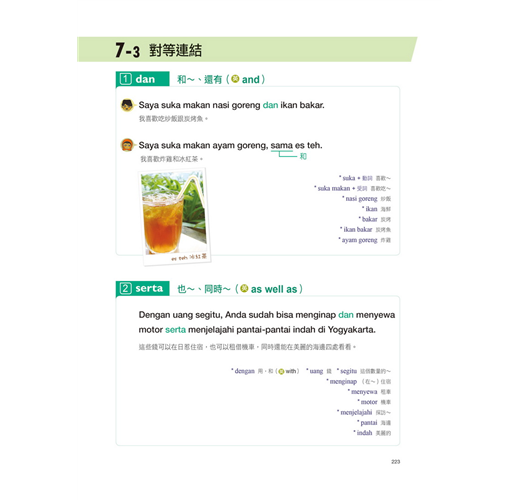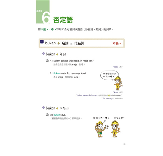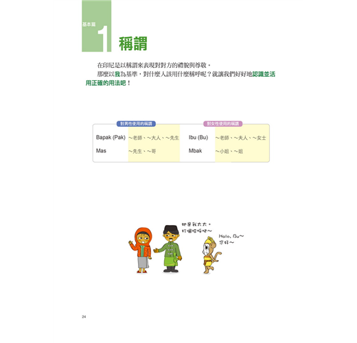 在學校學習英文時,一定也是從I, You, He, Her…這些基本的稱謂、語順、指示詞否定表現開始學。基礎,就是表達的第一步,要能穩固印尼語的基礎,這些是很重要的,本書在第一篇裡便花了許多的篇幅介紹,讓您循序漸進的掌握印尼語。
