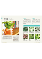 直覺式植物分類,依據小空間到大空間,收錄120種室內植物,包含清晰可辨的品種圖鑑、日常養護要領、澆水量,以及施肥、修剪作業、病蟲害防治,都有完整的提點,即使缺乏種植經驗,也能輕鬆養出漂亮盆栽。