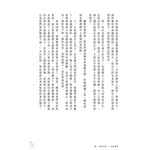 上一次意識到自己長大,是母親又問起我的近況,我懂得報喜不報憂了。我過得很好、飯都有準時吃、晚上沒有太晚睡,對母親撒點小謊並不是想要拿到小時候總期待拿到的印章獎勵,而是不想讓母親擔心;如何成為一個好兒子和一個好兄長,是我這輩子一直在學習的事。
