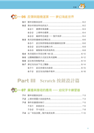 本書以Scratch 2.0版本為主,架構可分為基礎操作與範例實作兩大部分,前兩章針對Scratch的舞台、角色造型、音訊、程式積木的新增與編修做了完整的介紹,之後透過範例循序漸進的引導初學者活用Scratch的各種程式積木。