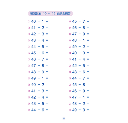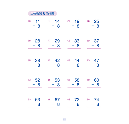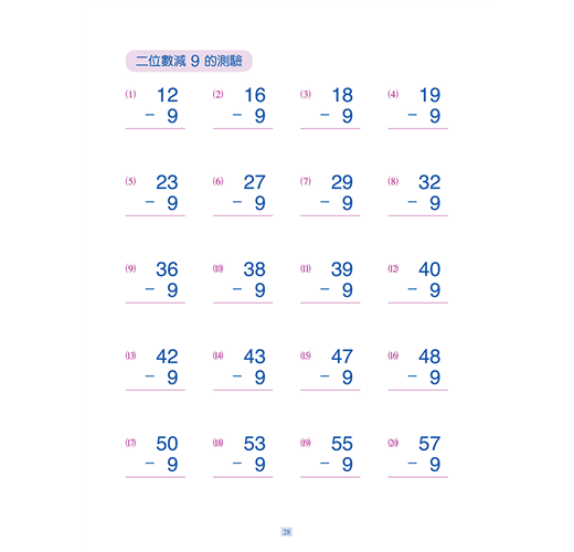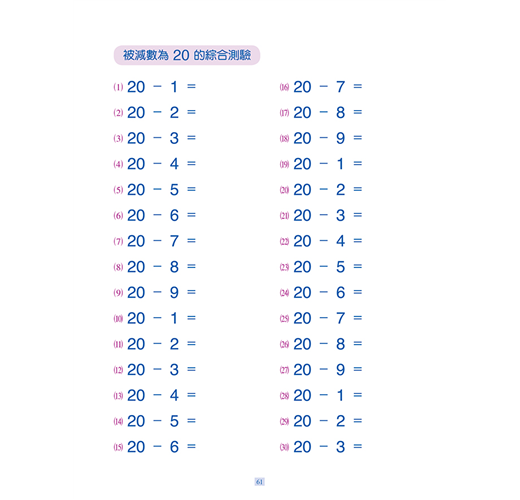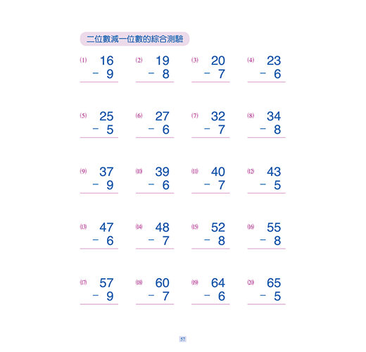 1.奠定孩子全方位的減法技巧。2.題目設計由淺入深,循序漸進的教導孩子。3.題目豐富完整,學習效果好。