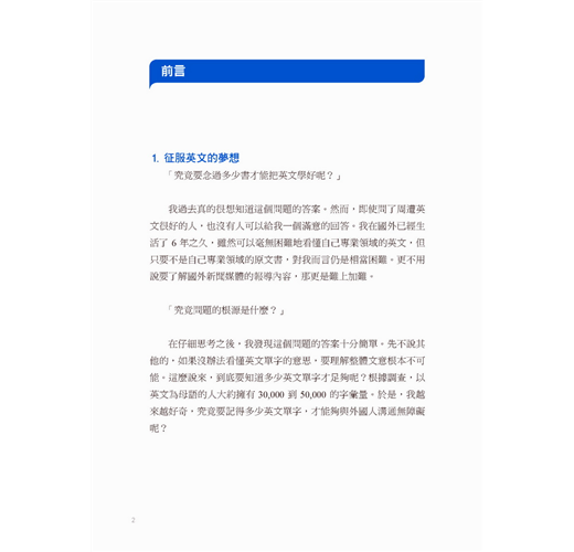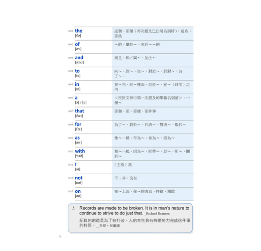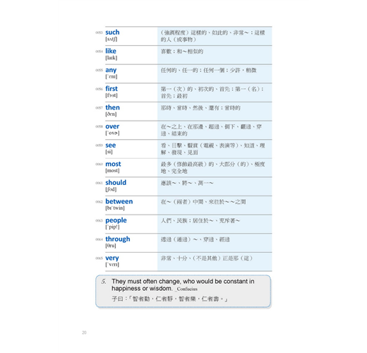 另外,在測試自己的英文程度時,也可以利用本書以使用頻率排列的特性。讀者不必從頭記到最後一頁,從哪一頁開始覺得單字陌生,就可以從那一頁以後加強自己的單字力。