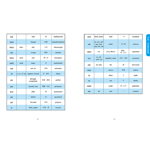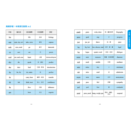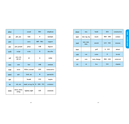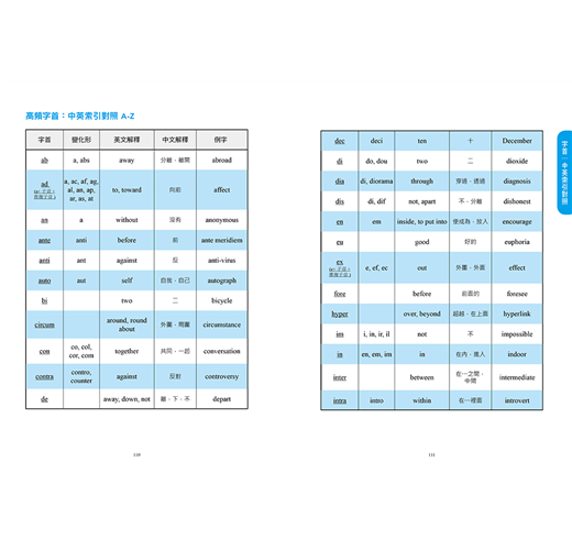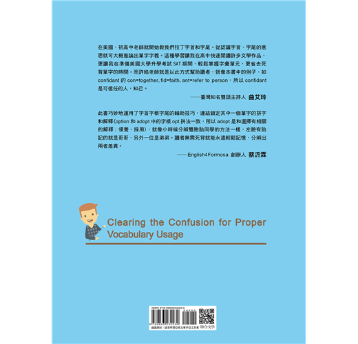 ──在美國,初、高中老師就開始教我們拉丁字首和字尾。從認識字首、字尾的意思,大概就能推論出單字的字意。這種學習讓我在高中快速閱讀了許多文學作品,更讓我在準備美國大學升學考試SAT期間,輕鬆掌握字彙單元,更省去死背單字的時間。而本書就是以此方式幫助讀者,就如書中例子,confidant的con=together,fid=faith,ant=refer to person所以confidant是可信任的人、知己。