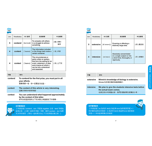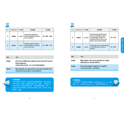 字彙,雙色對照,按字彙Level分級編排,不浪費多餘時間在冷僻少見的單字。
