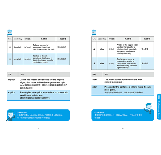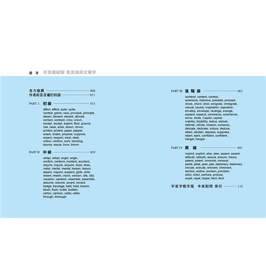 ──本書是一本非常適合有心提升英語字彙能力者的自學用書,清晰的版型鋪陳一幅匠心獨具的字彙學習圖騰—易混淆字、英英字義、實用例句、字源記憶,逐步引導讀者邁向成功學習目標,構築堅實英語能力。《形音義破解易混淆英文單字》相信是在校學生和自學人士必備、必讀的好書。
