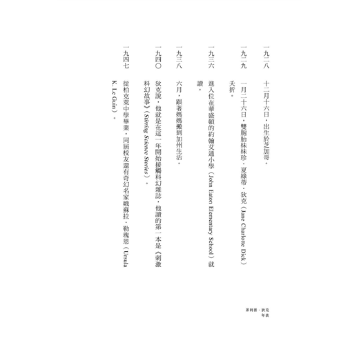 扭轉好萊塢眼界的科幻界唐吉訶德.科幻小說殿堂級大師 菲利普.狄克 Philip K. Dick(1928-1982) 1928年出生於芝加哥,大半輩子都在加州度過,曾短暫就讀加州大學,但在完成學位之前就中途輟學。1950年代崛起於科幻小說界,並發展出迥異於多數作家的獨特風格。1962年《高堡奇人》(The Man in the High Castle)贏得美國科幻小說界著名的雨果獎,並於2015年改編為電視影集;《員警說:流吧!我的眼淚》(Flow My Tears, the Policeman Said)贏得1974年約翰・坎貝爾紀念獎。1982年,導演雷利史考特將其長篇小說《銀翼殺手》改編成科幻經典電影。1982年,在電影上映前夕,狄克因中風導致心臟衰竭,逝於加州聖塔安娜。但一生潦倒的他,才正要開始影響世界。 狄克的作品有25部改編為電影,至2009年已累積約10億美元的票房收入,知名的有《銀翼殺手》《魔鬼總動員》《關鍵報告》《命運規畫局》《攔截記憶碼》等。受到他作品概念影響的,更是不計其數,包括《未來總動員》《駭客任務》《王牌冤家》《全面啟動》《極光追殺令》等,就連《愛在黎明破曉時》導演都改編過他的作品。奇幻教母勒瑰恩跟他是高中同學,但兩人當時不認識,後來彼此因為寫作出版相熟,勒瑰恩一直支持擁護他,甚至稱他是「美國土生土長的波赫士」。 隨著受狄克啟發而備受期待的電影《銀翼殺手2049》登場,他的影響力在當代持續發威,目前他的短篇小說也正改編為影集《電子夢:菲利普.狄克的世界》(Philip K. Dick’s Electric Dreams)。