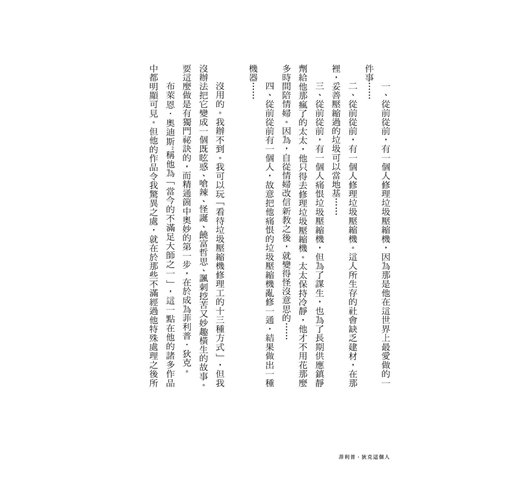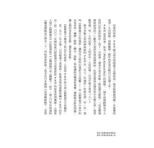 〈名家導讀摘錄〉◎導讀 你曾經有過的每一個想法都是真的 ──吳明益(東華大學華文系教授) 一九六四年菲利普.狄克在科幻雜誌《明日世界》發表了一篇短篇小說〈小黑盒子〉。主角瓊.哈喜是一位東方宗教專家,她爭取一個到古巴對當地中國人進行宗教指導的工作。當時開始流行一種新的宗教稱為「摩瑟黨」,信徒會使用一種「共感箱」,這個共感箱能讓握住它把手的人和宗教領袖「共感」。 瓊.哈喜原本的任務是宣傳古老的禪宗教義,但後來瓊本身和她的情人,既是演奏家也能讀心的馬利坦變成了摩瑟黨的信徒,而各國政府源於對這種新興宗教的恐懼,開始禁絕它…… 使用共感箱的細節,讀者透過PKD的描寫,或許會有這樣的感受:共感箱根本是一種前衛的「虛擬實境」科技。使用者可以與摩瑟老人對話,甚至會被丟向摩瑟的石頭擊中,感受到真正的痛感。光是這篇短短的作品,我就相信PKD這位在死後聲譽更加崇高的科幻作家,擁有一雙超越時代的眼睛。 PKD曾表示,一九六八年寫出的《銀翼殺手》便是從這篇小說衍伸出來的。地球在經歷另一次大戰之後,受到放射塵嚴重污染,許多人都移民外星了,大型企業不斷宣傳,留在地球就等著死亡與退化。伴隨著太空移民是仿生人技術的精進,地球人帶著仿生人開拓太空殖民地,讓它們擔任各種危險和底層的工作。部分越來越精進的仿生人選擇脫逃回地球,為了追捕它們,因此出現了「仿生人殺手」這樣的職業。 但你如果光是以看待傳統殺手的眼光來想像,恐怕不甚準確,因為在那個仿生人極度擬真的世界,任務最大的難關是: 怎麼辨識出仿生人? 這並不是一個簡單問句,而是千百年來人類透過哲學、藝術與科學反覆探究的問題,因為在西方,這可是涉及了宗教裡人僭越上帝形象的誘惑;而在演化論之後,這更關係到生態倫理學最核心的問題:在萬物尺度裡,人究竟位居何處? 這也是西方科幻小說極關注的議題之一,從瑪麗.雪萊的《科學怪人》、艾西莫夫的機器人系列,以及PKD的作品,莫不是在討論若人類有能力「喚醒、創造人造人」,豈不如同上帝?更深層的問題是:設若這些人造人已經逼近「生命體」(不妨稱之為準生命體),那麼人類是否有權剝奪它們的「生命」(此處又衍生一個問題,所謂的生命該怎麼定義呢)? 在和平相處的狀況下,人類扮演「寬大的上帝」不成問題,但如果有一天它們起而反抗,殺害、甚至奴役了人類,又該用什麼樣的律法或態度來對治? 如果我們再調換思考的對象,從這些「準生命體」的立場想。即便你是被「生產」出來的,當你有了思想、情感與信念時,你不會想成為一個「真正」的生命體,比方說「人」嗎? ◎菲利普.狄克這個人──美國科幻新浪潮旗手 羅傑.澤拉茲尼 菲利普.狄克的角色所在的世界是會無預警取消或更改的。「現實」大概就像政治人物的承諾一樣靠不住。造成變化的原因可能是一種藥、一道時空裂縫、一部機器,或是一個外星生命體,但無論是什麼為他筆下角色帶來令人摸不著頭腦的變動,結果都是一樣的:「現實」二字如人飲馬丁尼,甜度自知。然而掙扎還是繼續,抗爭還是繼續。對抗什麼?說到底,是勢力,是權柄,是王位,是統治與支配。而握有這些權力的人,往往本身也是受害者、囚徒和受人擺布的男女。 這一切聽起來都像是令人生畏的嚴肅題材,實則不然。把「令人生畏的」劃掉,加上一個逗號和以下這句話:但菲利普.狄克厲害就厲害在他的語氣。他擁有一種我難以形容的幽默。很酸、很怪、很胡鬧、很毒舌、很諷刺……這些形容詞沒有一個切中要點,卻又雖不中亦不遠矣。他的角色在最緊要的關頭出糗慘敗,最滑稽的場面透著最可悲的反諷。這是他成功導出一場戲的特質,難能可貴而令人肅然起敬。◎從前人們覺得他是神經病,現在人們相信他見過上帝 ──文字工作者 臥斧 PKD是菲利普.狄克(Philip Kindred Dick)的簡稱,一個生前被歸類為不入流科幻作家的傢伙;寫了一大堆書,讀者不是不買帳,就是讀完就罵,「這是哪個神經病寫的?」雖然大家認為他是神經病,但他也覺得這個世界不怎麼正常;他喜歡質疑一切:人的記憶、人的存在、人的好壞,以及什麼才算是「人」? 被大多數人當成神經病的PKD在一九八二年過世;但就在那一年,有一部叫《銀翼殺手》的電影,讓所有人對科幻電影大大改觀──在《銀翼殺手》當中的未來世界,擁擠、陰暗、髒污、混亂,科技讓政治機器更專權、讓階級分野更明顯、讓人類的劣性更直接、讓世界更亂。 《銀翼殺手》變成了科幻片的經典。它是由PKD的小說《銀翼殺手》改編的。