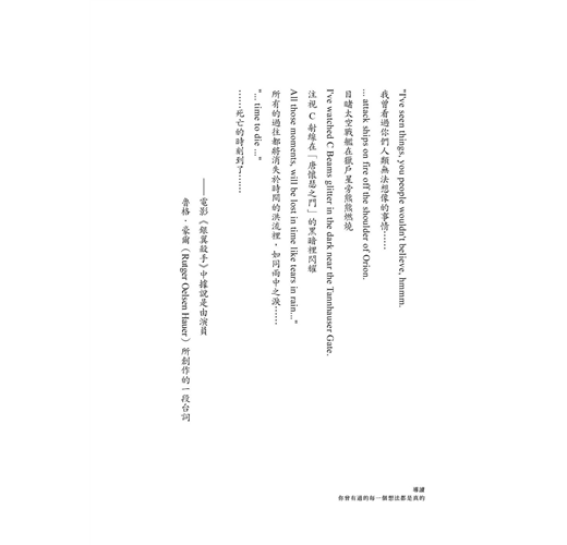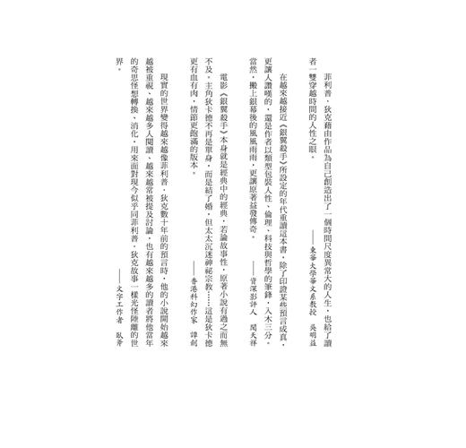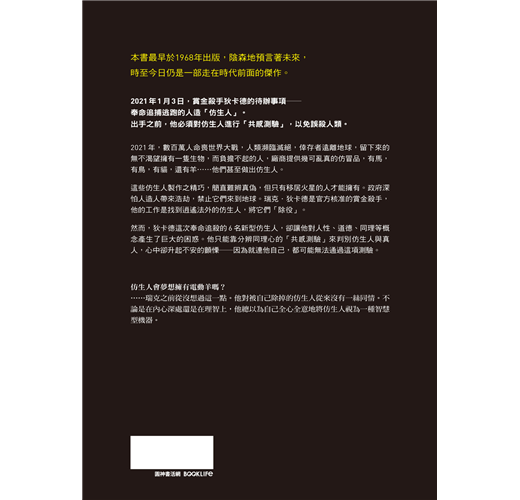 在越來越接近《銀翼殺手》所設定的年代重讀這本書,除了印證某些預言成真,更讓人讚嘆的,還是作者以類型包裝人性、倫理、科技與哲學的筆鋒,入木三分。當然,搬上銀幕後的風風雨雨,更讓原著益發傳奇。──資深影評人 聞天祥