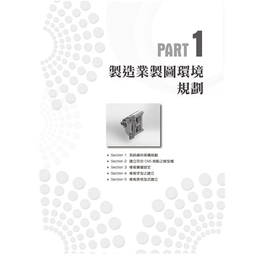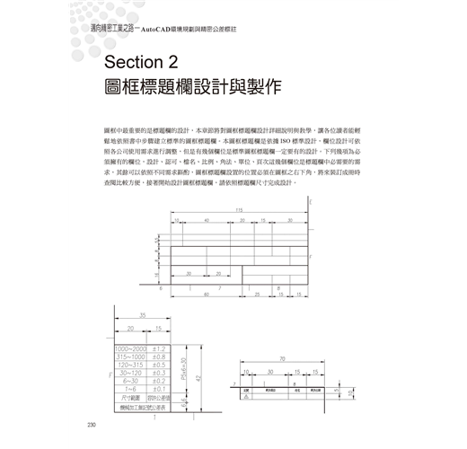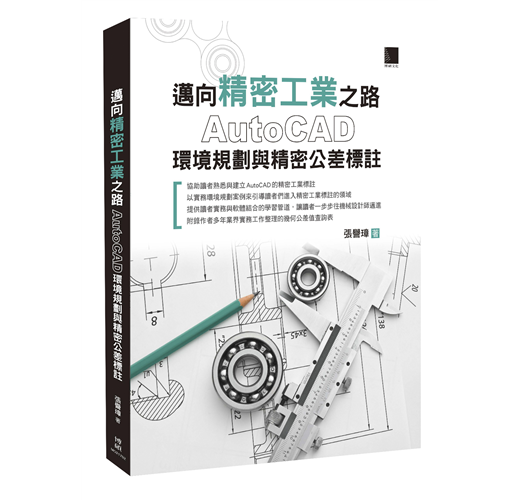 一張標準工程圖,必須符合國家標準所訂定的規範,而零件加工若不使用製造之公差,將影響組裝的過程,不但品質無法完全控制,可能還會導致企業不必要的損失。因此本書將引導讀者們,先建立一套AutoCAD製圖環境規劃,加上符合國家標準的工程圖樣板,才能讓每張工程圖的標準一致,不僅個人負責的產品零誤差,企業不合規格的損失也不再產生。本書就是想讓業界人士藉由本書提供的環境塑造與國家標準公差表,更加提高工作的精準度與工作效率。