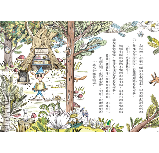 藍色小精靈覺得生活好無聊,於是在橡樹下開了一家蛋糕店,顧客每天吃到美味的戚風蛋糕,他覺得好有成就感,生活好有意義。紅色小精靈和黃色小精靈也來幫忙,但他們怎麼愈幫愈忙?