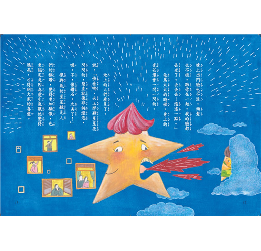 天上有一顆壞脾氣的星星,他動不動就愛生氣,愛生氣讓他亮閃閃,愛生氣讓他變美麗,於是他拚命的生氣,一直生氣,很用力的生氣,氣到全身燒起來了!