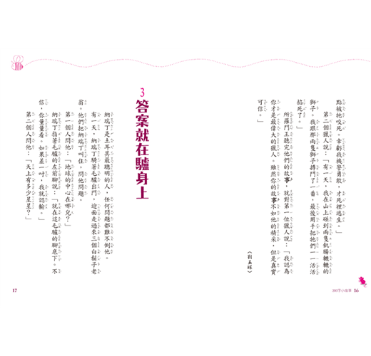 名人推薦:《三百字故事》本來是國語日報兒童版的一個專欄。這個專欄的名稱是〈小學國語補充教材〉,由語言學家王玉川先生主編。這個專欄的徵稿條件是每篇不超過三百字,而且要有趣味。出書的時候,才採用《三百字故事》這個引人注目的書名。這本故事書的優點,就在「精短有趣」這四個字上面。