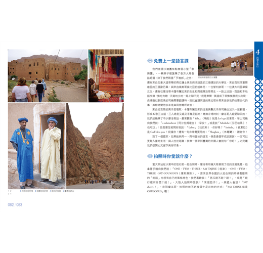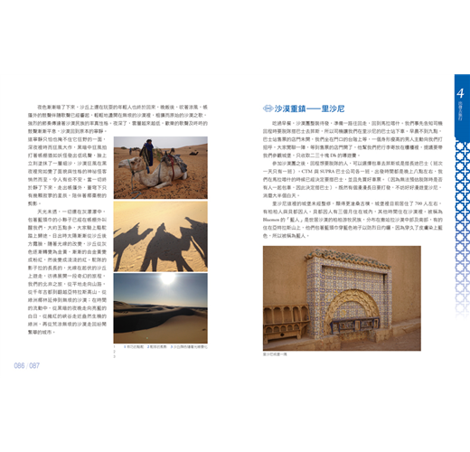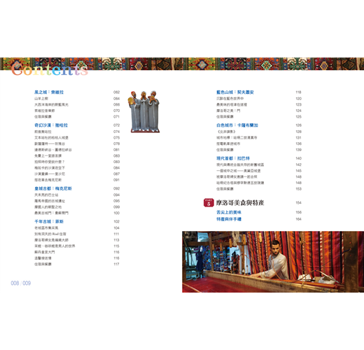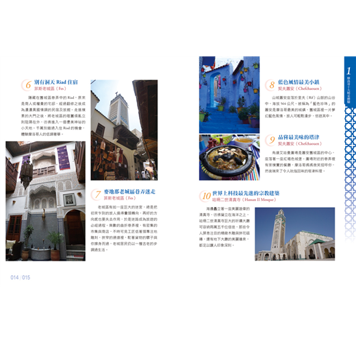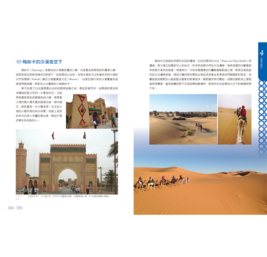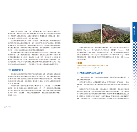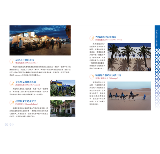 2.本書標記摩洛哥最精采的十大體驗、摩洛哥道地美食、摩洛哥特產及伴手禮,提供規劃行程者實用的參考;利用所提供的交通、食宿資訊,讓旅人方便安排行程,兼具實用性和文化深度。
