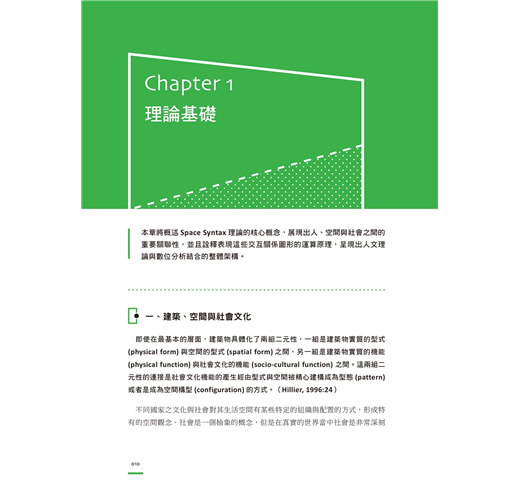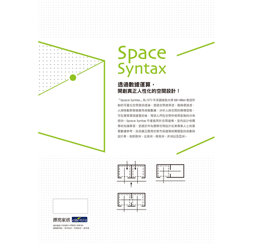 「Space Syntax」為1970年英國倫敦大學Bill Hillier教授所創的可量化空間資訊理論,透過空間使用度、動線便捷度、人潮移動群聚模擬等經驗數據,分析人與空間的種種型態,可在實質環境建置前後,預測人們在空間中使用型態的分佈傾向。Space Syntax不僅適用於空間建構、室內設計相關學術知識學習,更適於作為實際空間設計從業專業人士的重要數據參考。目前廣泛應用於都市與建築相關類型的規劃與設計案,包括歐洲、北美洲、南美洲、非洲以及亞洲。