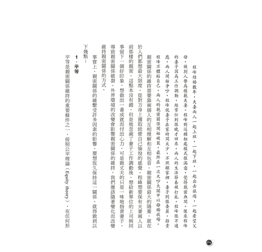 親密關係的維持需要靠兩個人的互相理解和互相包容。親密關係最大的隱憂,就在於人們都想最大限度,從對方身上獲取能使自己愉悅的感覺。程峰想要保有夫妻兩人以前那樣的親密,這點本沒有錯,但是他忽視了妻子工作調動後,想給新單位的上司與同事留下一個好印象,想做出一番成就而付出心力,可是做丈夫的只是一味地指責妻子,導致親密關係破裂。外界環境的改變會影響親密關係的維持,我們應該隨著變化而改變維持親密關係的方式。