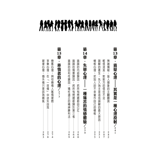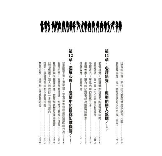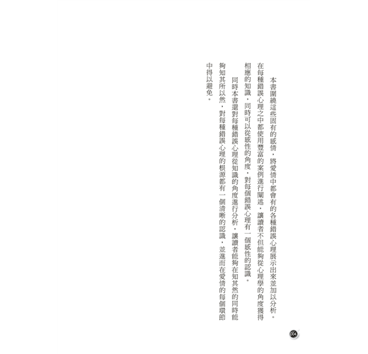 本書圍繞這些固有的感情,將愛情中都會有的各種錯誤心理展示出來並加以分析。在每種錯誤心理之中都使用豐富的案例進行闡述,讓讀者不但能夠從心理學的角度獲得相應的知識,同時可以從感性的角度,對每個錯誤心理有一個感性的認識。