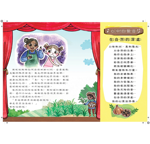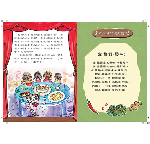 「品格音樂劇場」系列書,藉由12首歌曲的引導,一個簡單的故事,可以討論 12 個主題之多,是坊間一般童書做不到的。每一個畫面,搭配一首歌曲,以細膩的歌詞和優美的旋律,將主題重點帶入孩子心中,達到對故事深入的理解,堪稱出版首創!