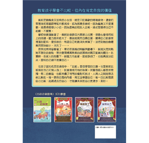 在孩子認知成長的過程中,「比較」是個學習的主題。但是若把比較用在自己和別人身上,就會造成可怕的後果。因為每個人都是世間獨一無二的創造,也都具備了特有的優點和長才,人與人之間是無法做比較的。唯一要做的是向內看,肯定並尊重自己;唯一的比較是跟自己比較,超越過去的自己,才能讓未來的自己更進步、美好。