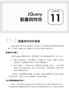 •完整說明jQuery選擇器、事件處理、動畫特效和表單處理,常用介面的選單、巡覽與標籤頁。