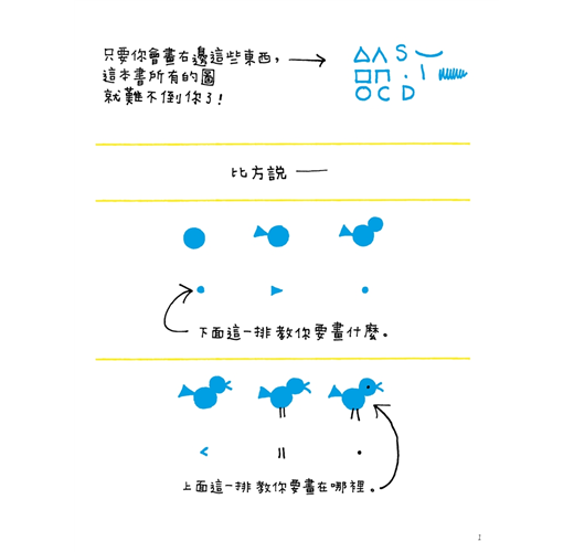 為了不讓孩子一開始就被「我畫不出來」的挫敗困住,沒得到快樂只得到失望,他設計出一套簡單又高明的方法,把世間萬物的樣子拆解開來,化成所有人都能畫出的點、線、幾何圖形,教孩子一步步組合,創造出無窮的世界。