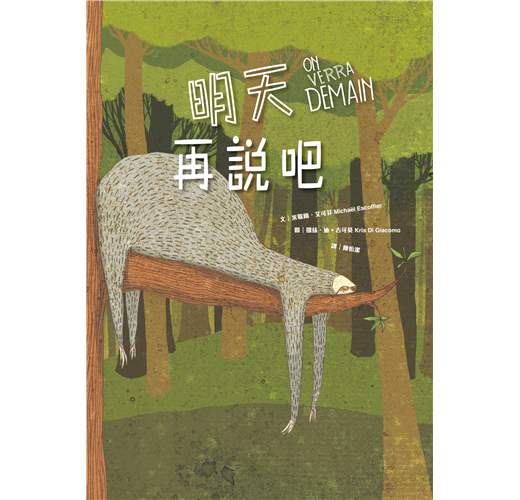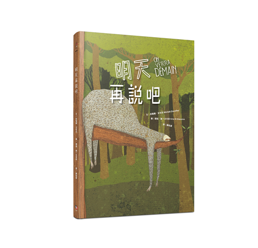 第一眼看見《明天再說吧》時,立即被繪者筆下的圖牽引著。書中逗趣的圖畫,色彩協調,看了十分喜歡,忍不住盯著圖畫看,一頁翻過一頁。作者以動物為主題,尤其以長相習性特殊的樹懶做為主角,成功的抓取大小讀者的目光。