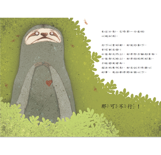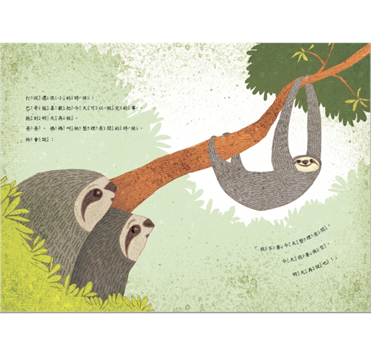 故事中有個凡事慢慢來,帶有點「懶」字意味的樹懶巴哥,他與「效率」沾不上邊,對於團體生活不感興趣,喜歡懶洋洋的窩在樹上。在他的行事曆裡,永遠都只有明天的行程,但當「明天」變成「今日」時,事情又拖到明日,就這樣日復一日。以現代語言來說,巴哥大概是「宅樹懶」。看到這裡,我這個快拍子、行動派的人都忍不住想站起來說:「樹懶,你快動起來!」