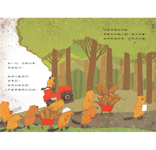 牠對著河狸們說,在這棵神奇的樹上曾經看過會爬樹產卵的藍蛙、長得像枯枝的蟲、翅膀上有雙大眼睛的蝴蝶、可以在水上行走的蜥蜴還有七彩羽毛的鳥。哇!聽著巴哥活靈活現地描述,讓河狸們忘了伐樹的工作。