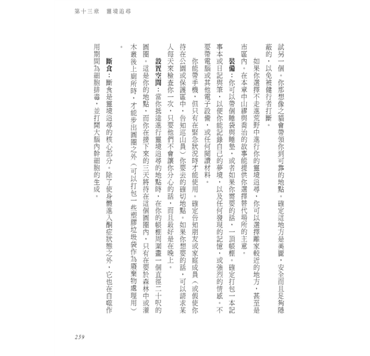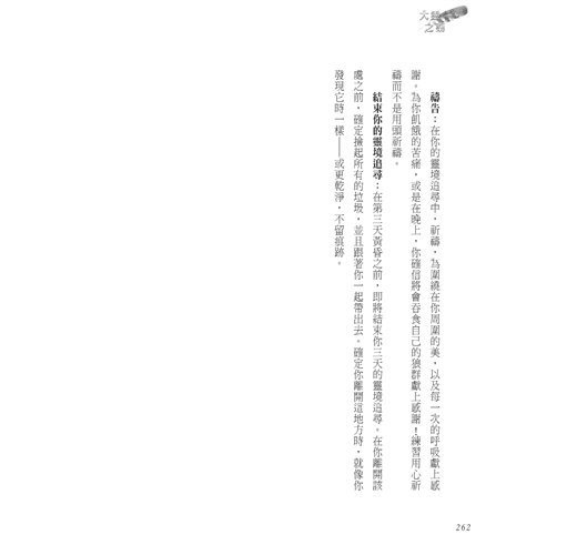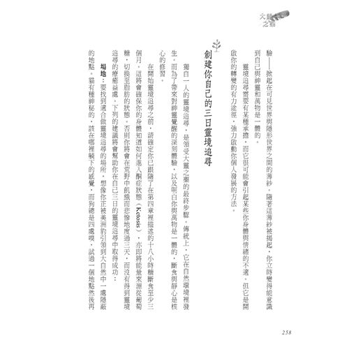 大靈之藥的核心是一個古老的修習,名為靈境追尋,是一個與自然和隱形世界精心安排的邂逅。藉由斷食與靜心,靈境追尋喚醒體內的自我修復與再生系統,並且使你重新連結神靈,以及自己的深刻目標。我受訓成為薩滿的傳統文化之中,在荒野尋找靈境是慣例。但對大靈的體驗在哪裡都可以發生—甚至在你自家花園,或是一個大型都會公園裡。