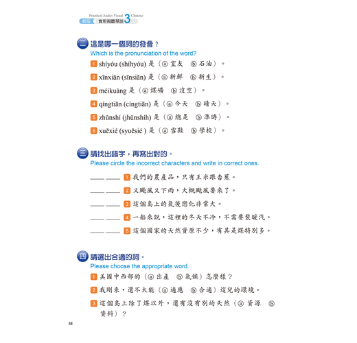 ☉本作業簿配合教材使用,全冊搭配生動的彩色圖片做練習,並以各種題型練習生詞、語法要點及讀寫中文,包括發音、改錯字、選擇、連連看、填空、重組及英譯中等,能幫助學生加強練習,並了解學習成果。