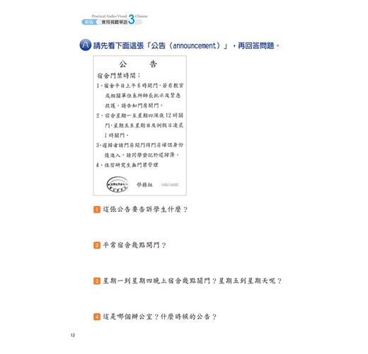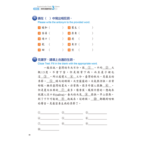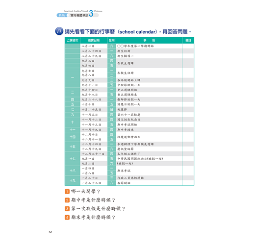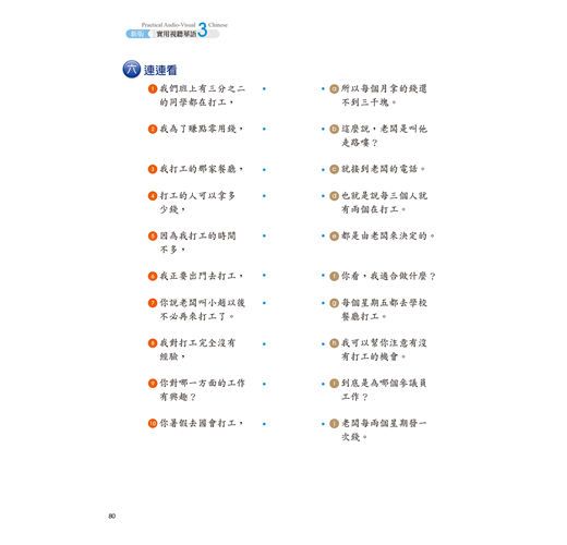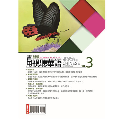 新版實用視聽華語共分(一) (二) (三) (四) (五)等五套,每套包含課本、教師手冊、學生作業簿、教學MP3等教材,由台灣教育部策畫,是目前最具權威性,最完整而實用的成人華語鉅著,受到台灣各華語中心及補習班喜愛並廣為採用,未來將陸續規劃出版電子書。