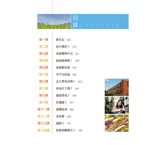 本教材為培養初學華語者聽、說、讀寫能力,課程設計以語法句型為骨幹,配以中國人日常生活用語,以期達到實學實用目標。每冊教材所包括的內容大致如下:1.課文、對話;2.生字、生詞及用法;3.語法要點及句型練習;4.課室活動;5.短文;6.注釋。