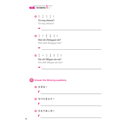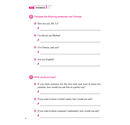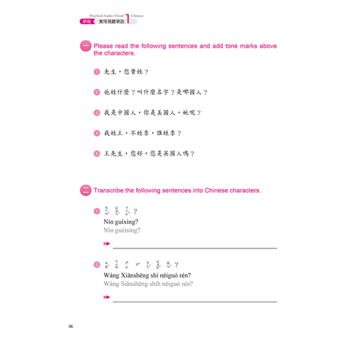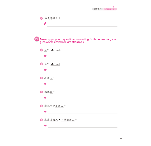 ☉本作業簿搭配教材,分為生字筆順學習及字音(包括音調)、字形(包括辨字、填空)、造句、重組、選擇、中譯等綜合練習,另有互動問答,以加強練習並了解學習成果。