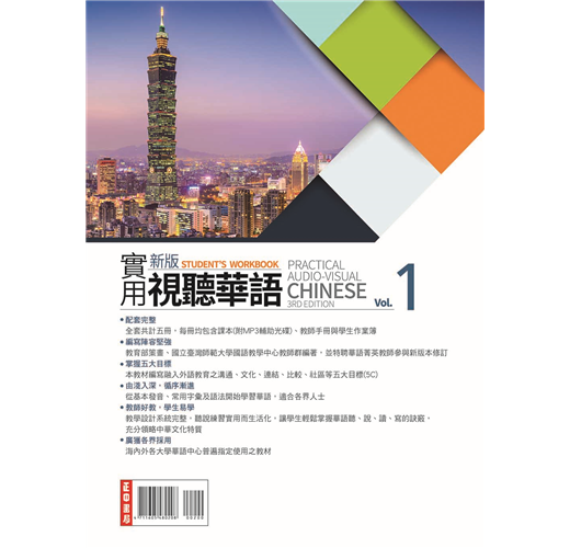 新版實用視聽華語共分(一) (二) (三) (四) (五)等五套,每套包含課本、教師手冊、學生作業簿、教學MP3等教材,由台灣教育部策畫,是目前最具權威性,最完整而實用的成人華語鉅著,受到台灣各華語中心及補習班喜愛並廣為採用,未來將陸續規劃出版電子書。