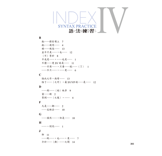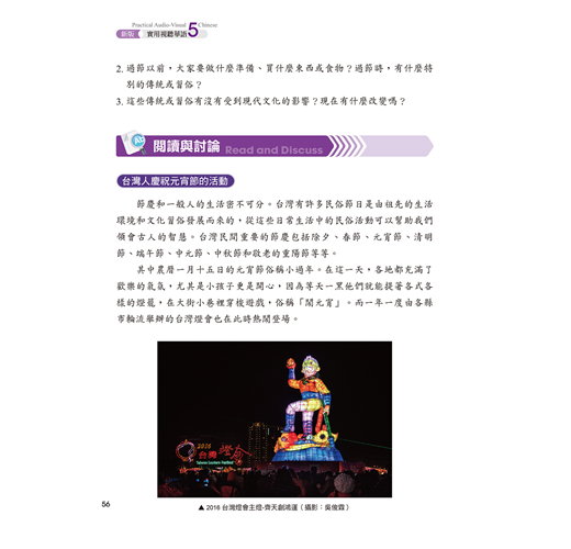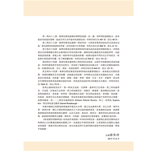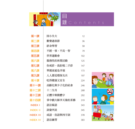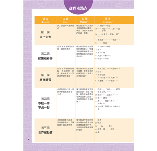 ☉第五冊共14課,本冊重點是鞏固高級學習者的成篇溝通能力,使其能以完整的話語和篇章、清楚的邏輯及正式的語體,談論廣泛的話題。本冊課文以記敘文與議論文為主,主題富含社會意義,如節慶、教育、運動、保健、休閒、環保、生肖、文字、茶藝等。語法單元引導學習者熟悉具語篇功能的句型,而成語及俗語的單元則補充文化概念。本冊共有生詞 1004 個,語法 70 則。