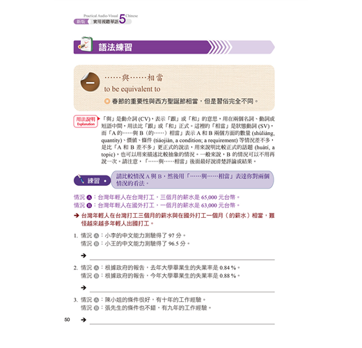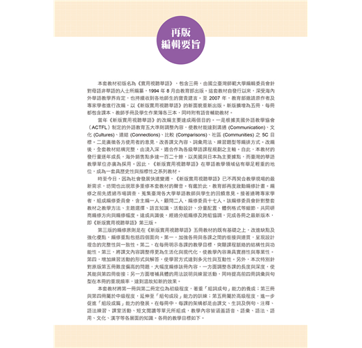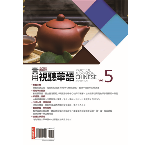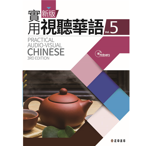 新版實用視聽華語共分(一) (二) (三) (四) (五)等五套,每套包含課本、教師手冊、學生作業簿、教學MP3等教材,由台灣教育部策畫,是目前最具權威性,最完整而實用的成人華語鉅著,受到台灣各華語中心及補習班喜愛並廣為採用,未來將陸續規劃出版電子書。