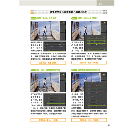 消除死白或漆黑問題讓影像細節重現/細膩調整各項「色相、飽和度和明度」/裁切不需要的部分讓主體更為明確/輕鬆去除影像中的灰塵、雜點/修正相機的色調或鏡頭像差問題/善用「預設集」打造出色的黑白影像