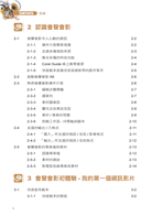 前三章主要介紹影片基本知識以及會聲會影基本操作方法。第三、四章是素材蒐集秘訣,學習從各種來源擷取影片。第五~十一章則透過各種實際範例讓您了解設計與剪輯影片的各種技巧。第十二章則是根據不同的需求輸出完成的影片,如燒錄成影音光碟、發佈至網頁、上傳分享到網路上等等。