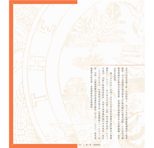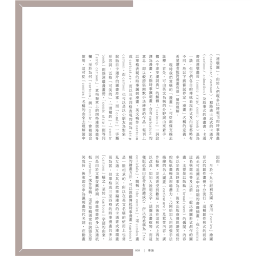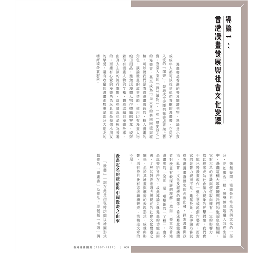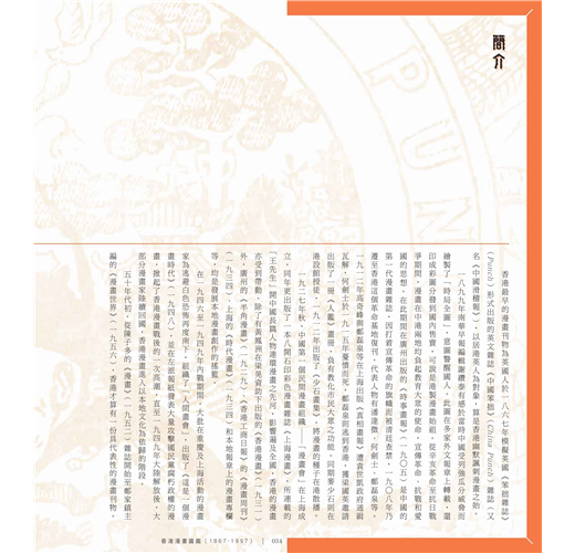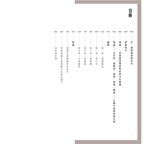 全書分作五大類別:「漫畫雜誌」、「單行本」、「連環圖」、「漫畫報」、「兒童讀物」,選輯近千個極珍貴的漫畫作品封面,配上深入淺出的圖片說明,為讀者提供一輯豐富的、可「看圖索引」的香港漫畫歷史資料。此外,各章節均有精要簡介,簡略勾劃整體個別漫畫種類的發展,讓讀者對它們彼此的異同與相承略窺一二,以至加深了解本地漫畫與香港社會文化變遷的互動,一同展望香港漫畫往後的發展。